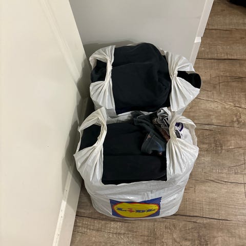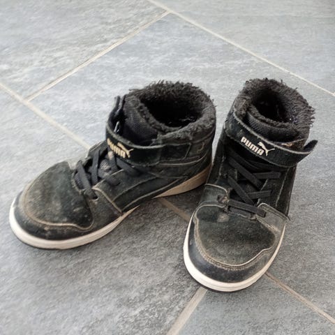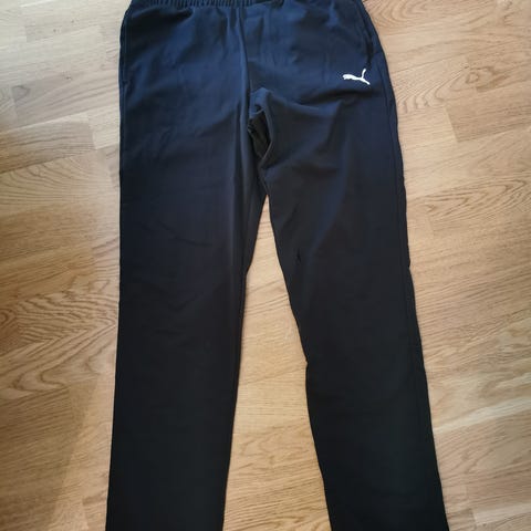 Puma collegehousut. Koko 128. Molemmissa polvissa reikä. Leikkaa vaikka shortseiksi. Annetaan.