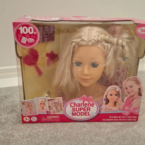 Vaaleatukkainen kampauspää ja pinkki hiusharja.