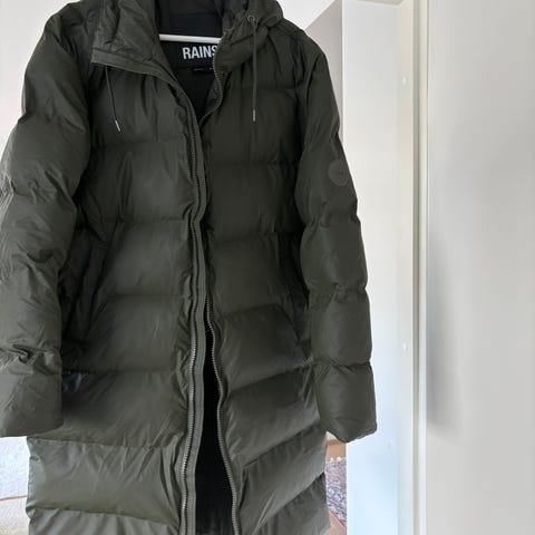 Rains musta pitkä veden- ja tuulenpitävä toppatakki. Takki on kevyt ja mukava päällä. Kunto erittäin siisti; ollut käytössä vain muutaman kerran. Koko S. Joustava vyö.
