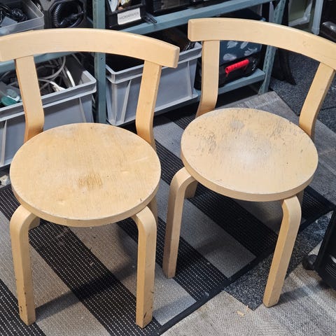Ostettu projektiksi, mutta oma aika ei riitäkään tämän kaunottaren kunnostukseen. Vintagetuoli sormiliitoksin ja talttapääruuvein. Ehyt muutoin, mutta pinta kaipaa uutta päivitystä, suurin työ lienee istuinosan viilutuksen kunnostamisessa. Toimiva tuoli ilman kunnostustakin mikäli elämän jäljet eivät haittaa.