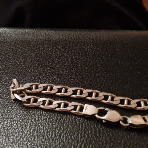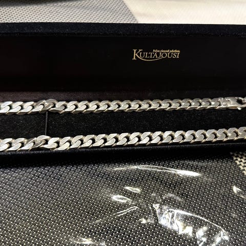 Hopeinen näyttävä ranneketju, pituus 20,5 cm, leveys n. 1,2 cm. Paino 27 g. Leima 925. Uudenveroinen.