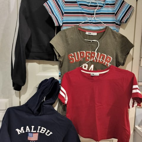 Trikoohousut, sellaista laskeutuvaa kangasta, 164 cm Lindex vissiin käyttämättömät, H&M Neule lyhyt musta koko XS ja Shein lyhyt paita uusi koko S.