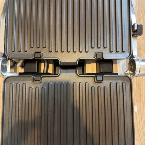 Grillissä on kahdet paistolevyt, joista kaksi on tasaista ja kaksi uritettua. Paistolevyn irrotus tapahtuu helposti sivulla olevaa painiketta painaen ja takaisin laitettaessa levy lukkiutuu automaattisesti. Paistolevyt ovat pinnoitetut, joten niiden puhtaanapito on helppoa ja voit lisäksi laittaa ne käytön jälkeen astianpesukoneeseen. Vaikka toiset levyt olisivat vielä pesussa, niin ylimääräisten levyjen ansiosta grilliä ei tarvitse kuitenkaan jättää käyttämättä.