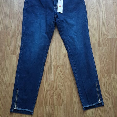 Käyttämättömät farkut. Säilytyksessä tullut takaosan lahkeeseen hengarista vaaleata painaumaa.