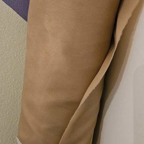Ehjä ja yhtenäinen 12 metrin pala hennon roosan/vaaleanpunaisen väristä kangasta, jonka leveys on 220 cm. Kangas on jotain tekokuitua, kimaltaa lievästi ja on läpikuultavaa. Sopii hienosti esim. verhokatoksen tekoon.