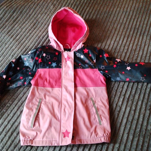 Vaaleanpuna-harmaa fleecevuorellinen sadetakki koossa 110 cm. Eläinten kuvia.