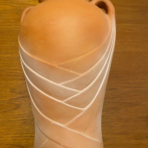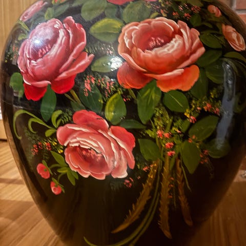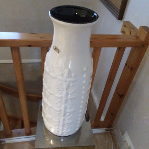 Hyvässä kunnossa oleva vanha iso lattiamaljakko keramiikkaa, jossa pieni krakelointi tuskin havaittavaa. Korkeus 55 cm ja suuaukko 24 x 12 cm. Valmistaja ei tiedossa.