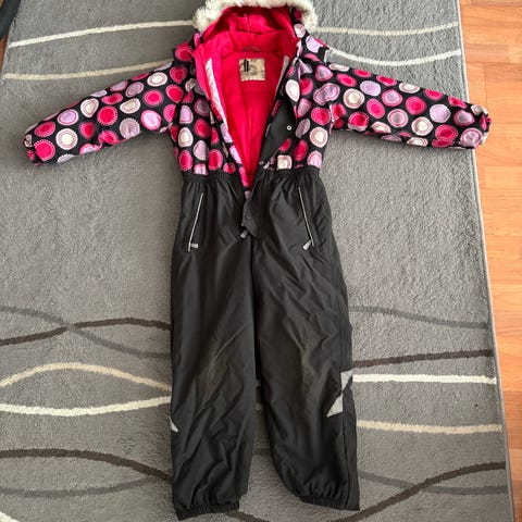 Luumunvärinen Reima Stavanger 134, hyvässä käytetyssä kunnossa, tuli meille yhden vähän käyttämänä ja meillä jäi käyttämättä kokonaan. Polvet on vahvistettu ennakoivasti vedenpitävällä kulutusta kestävällä varusteteipillä. Oikeassa polvessa teippaus epäonnistunut ja siihen jäi minit rutut. Haalari on pesty kerran.