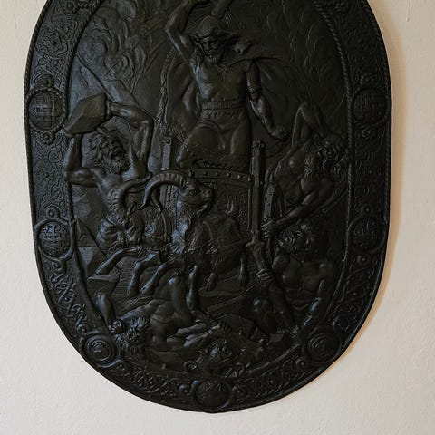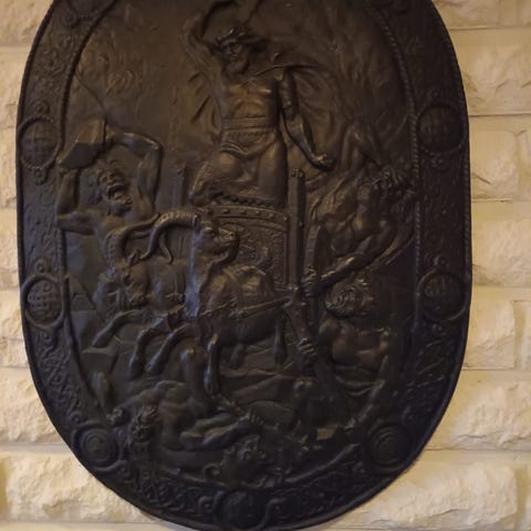 Myydään Högforsin Ukkosenjumala-reliefi. Uudistuotannon versio Karkkilan Högforsin myymälässä 325 euroa.