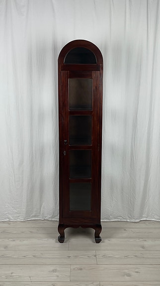 Tuotetiedot: Kaksiosainen hieno vitriini. Vitriinin alaosassa on yksi irrotettava puuhylly ja yläosassa kolme irrotettavaa lasihyllyä. Yläosan sisäseinä on peiliä. Molemmat lukot toimivat ja kaksi avainta tulee mukana.
