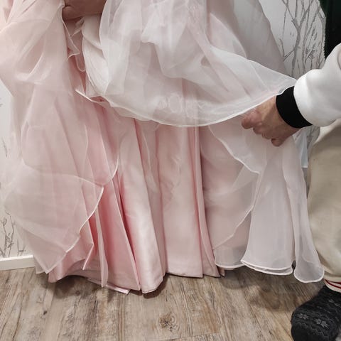Ompelijalla teetetty alunperin vanhojentanssipuvuksi, ja kerran ollut käytössä sen jälkeen Rukin tanssiaisissa. Koko n. XS-S. Shampanjan värinen ja viininpunaiset yksityiskohdat. Saman väriset hanskat.