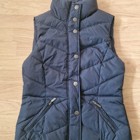 Tikkikankainen, vuorellinen toppaliivi, tummansininen, olkapäiden ruskea osa samettia, irrotettava karvallinen huppu, liivin kiinnitys vetoketjulla ja napeilla, tosi lämmin, vyötärössä säätö mahdollisuus napeilla, taskut, sopii ulkoiluun, urheiluun, ratsastukseen, pyöräilyyn.