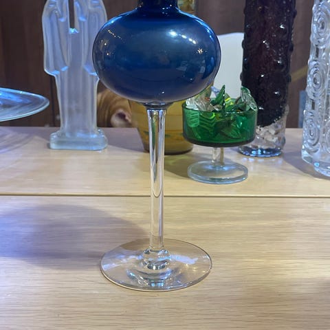 Myydään Iittala 2660 kirkaslasinen kynttilänjalka. Suunnittelija Erkki Vesanto, valmistaja Iittala ja valmistusvuodet 1965-1970. Korkeus 17 cm, halkaisija 9 cm ja paino 260 g. Erinomainen kunto, ei juuri käytön jälkiä.
