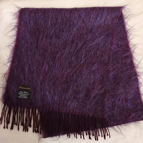 Mulberry Heritage huivi, 90 % merinovillaa ja 10 % kashmir. Pituus 164 cm, leveys 26cm. Kunto muuten erinomainen, jokusen verran hapsuja osittain lähtenyt purkautuu, ei vaikuta mitenkään yleisilmeiseen.