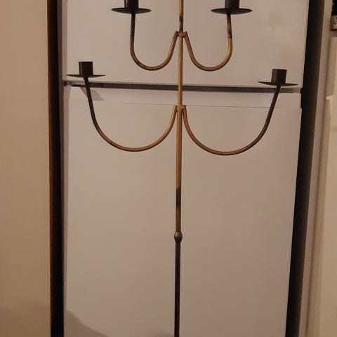 Kaunis ja siro messinkinen neljän kynttilän jalka, pienille kynttilöille, (joulukuusen) tai pienille pallokynttilöille. Samanlaista sarjaa kuin nro 64 lampettija nro 66 pienet kynttilänjalat. Tässä on keskellä ollut varmaan jokin lasiastia, sitä ei ole tallessa. Siinä on varmaan ollut tuikku tai jotakin esim karkkia. Korkeus 16 cm ja pituus 34 cm. Muuten siisti ja ehjä. Postitus tai nouto.