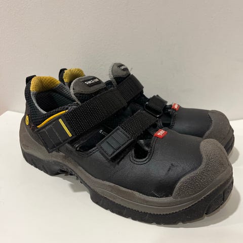 Ok kuntoiset, ehjät Jalas turvasandaalit varvassuojalla. Hieman kulumaa kärjissä ja pohjassa.