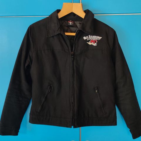 Oikein hyväkuntoinen välikausitakki. Vuorellinen. Kivoja yksityiskohtia kuten hihojen keinonahka. Suoran mallinen.