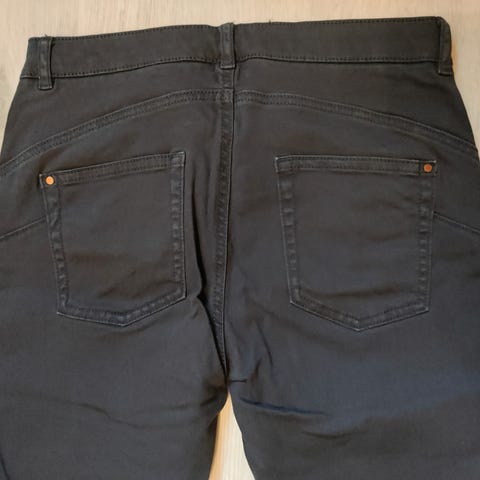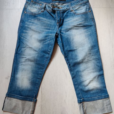 Hyväkuntoiset käytetyt tummansiniset kesäfarkut. Lahkeissa napit. Edessä nappi/vetoketju.