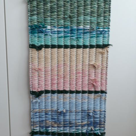 Kaunis käsinkudottu puna-valko-beige seinävaate / matto. Sopii myös tuolin päällykseksi. Pituus 135 cm, leveys 73 cm. Molemmissa päissä on hapsut n. 2 x 7 cm. Vaatetta ei ole käytetty, vaan säilytetty kaapissa.
