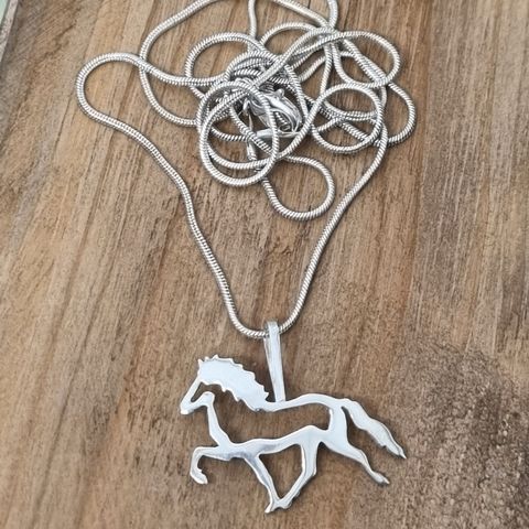 Hevosaiheinen kaulakoru, sekä ketju että hevonen 925 hopeaa. Ketjun kokonaispituus 40 cm.