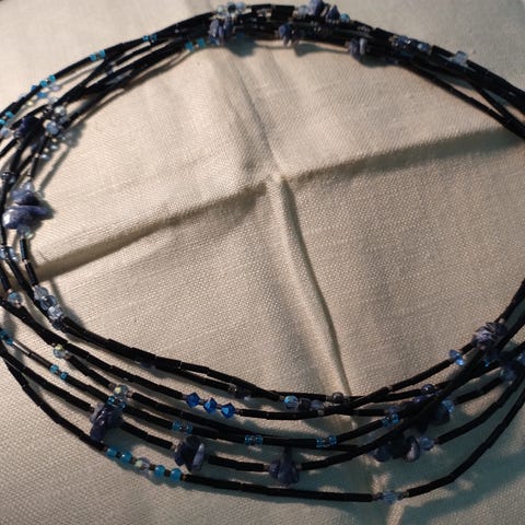Uudenveroinen tyylikäs kaulakoru. Käsittääkseni kivet ovat orgaanisia. Pituus 45 cm + pidennysosa 6 cm.