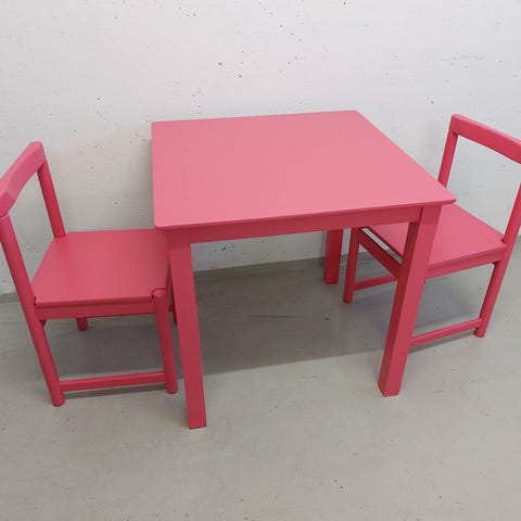 Pinkkiä väriä tarjolla keittiöön! Ihanan vaaleanpunainen ruokaryhmä vailla uutta omistajaa. Setissä on keittiön pöytä ja kolme keittiötuolia. Pieneen keittiöön erinomaisesti sopivat kalusteet. Kaikki ryhmän kalusteet on juuri kunnostettu ja maalattu laadukkaalla kalustemaalilla. Kalusteet eivät ole olleet käytössä maalauksen jälkeen. Kaikissa siisti ja kaunis maalipinta, mutta ei kuitenkaan täysin virheetön. Ehjiä ja tukevarakenteisia kalusteita kaikki. Pöydän mutterikiinnitteiset jalat helposti irrotettavissa kuljetusta varten tarvittaessa. Kalusteet ovat mitoiltaan: