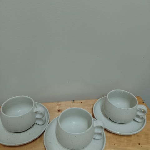 Myydään kaksi Pentikin teekuppia lautasineen. Koko setti (kaksi kuppia ja kaksi aluslautasta) 40e.