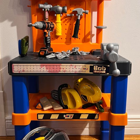 Pojille työtaso johon kuuluu työkalut mukaan. Remontti leikit.