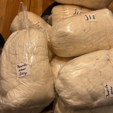 3 kerää isoja puuvillalankarullia, väri haalean keltainen