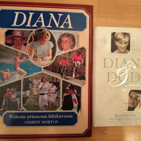 Dianasta kertova kirja on suomeksi, kuningattaresta kertova kirja on englanniksi. Myydään yhdessä hintaan 9 euroa.