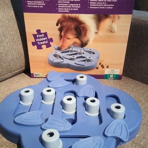 5 koloa liukuluukkujen alla, keskellä 2 koloa. Puinen. Omalle koiralle liian helppo.