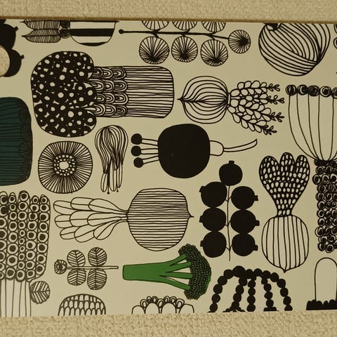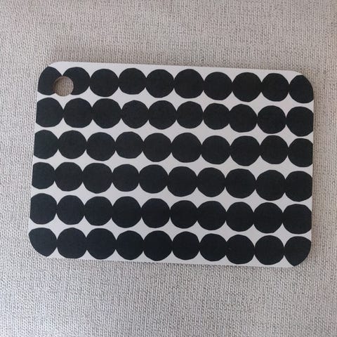 Räsymatto kuvio, mustavalkoinen, musta, valkoinen, mustat pallot, Marimekko leikkuu lauta, Siirtolapuutarha, tarjotin, tarjoilualusta, tarjoilu, alusta, Finnish design
