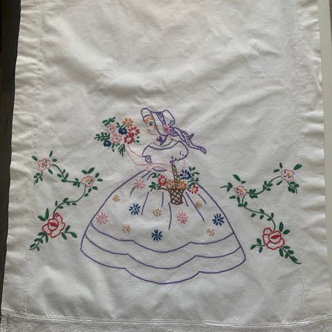 Kirjontatyötä on tehty noin 2/3 kuvassa näkyvän mukaisesti, ja työ odottaa jatkajaa. Kirjontatyö on tehty siististi.