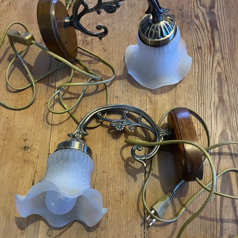 Myyn toimivan vintage seinälampetin pienellä sinisellä varjostimella.