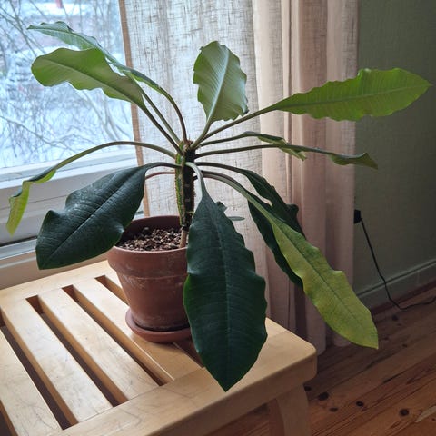 Nukkatyräkki, joka tekee uusia lehtiä koko ajan. Helppohoitoinen kasvi. Uudet kuvat, koska nämä kasvaa vauhdilla.