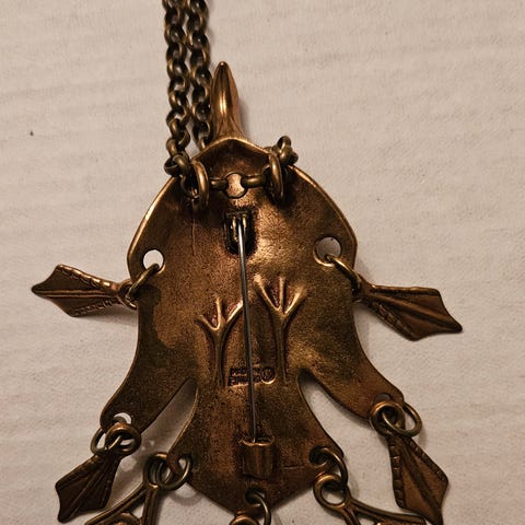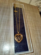 Pronssinen koru pitkällä ketjulla. Muuten erittäin hyvässä kunnossa, mutta rasian kulma vähän haljennut.