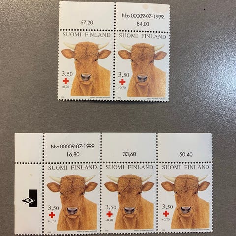 Leimaamattomat, postituoreet 1 lk tarrapostimerkit 6 kpl:
