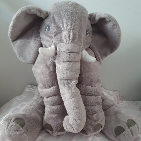 Uudenveroinen mutta vanha valko-vaaleanharmaa norsu pehmolelu, jossa joku pieni helistin sisällä. Korkeus n. 20 cm. Ei ole koskaan ollut lapsen käytössä, vaan koristeena tai laatikossa säilytetty. Merkki on Stockmannin KAMU. Tuo pehmolelu on vuodelta 1988.