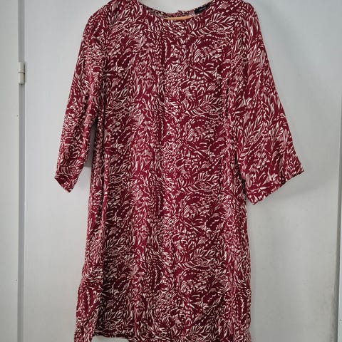 Naisten suoralinjainen kuosillinen Runotar-mekko. Mekossa on kantilla viimeistelty ovaali pääntie, jonka takana on nappihalkio. Mekon väljät hihat ovat 3/4 pituiset ja sivuissa on taskut.