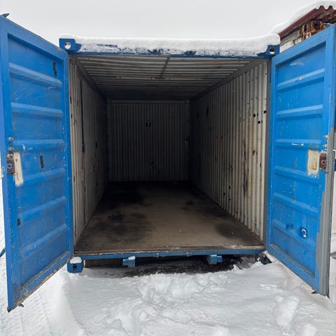 6 metrin kontti . Sisällä hyllyjä. Muutama lommo tullut matkan varrella.