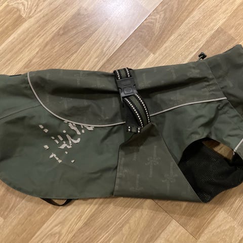 Koiran takki, joka suojaa viimalta ja kevyeltä sateelta. Kunto hyvä. Pesty, mutta karvoja jäänyt enkä vielä niitä koittanut putsata. Koko 45.
