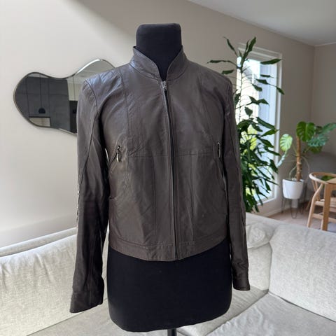 Myydään harmaanruskea nahkatakki. Nahassa on hieman patinaa, mutta yleisesti näyttää hyvältä.