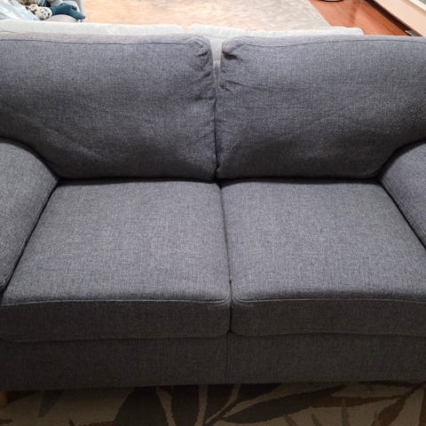 Tumman sininen pikkusohva, jonka selkänojaa saa säädeltyä ja laskettua makuuasentoon saakka. 164cm leveä. Muhkeat tyynyt. Pelkkä nouto.