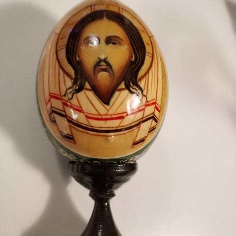 Kaunis, taidokkaasti maalattu muna kirkon maisemalla. Korkeus 20 cm.