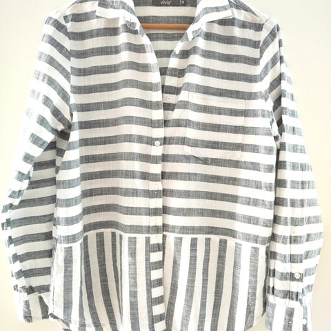 Myydään raidallinen, lyhythihainen paita. Kokomerkintä M. Helman pituus 57,5cm.
