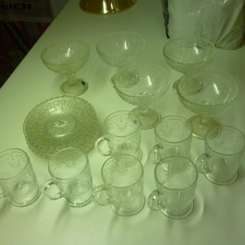 Myynnissä 12kpl (joista 1kpl hieman pienempi) Apila retro sarjaa. Väri meripihka/ rusehtava.