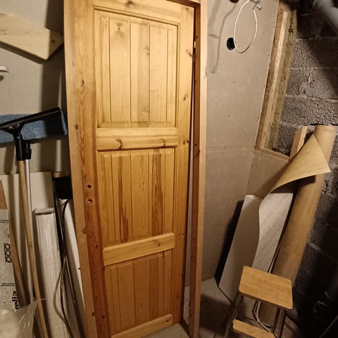 Väliovi lakattu mänty. Käyttämätön varastossa seissyt, jotain pieniä jälkiä varastoinnista tullut. Sopii 9x20 karmeihin. Karmeja ei ole.