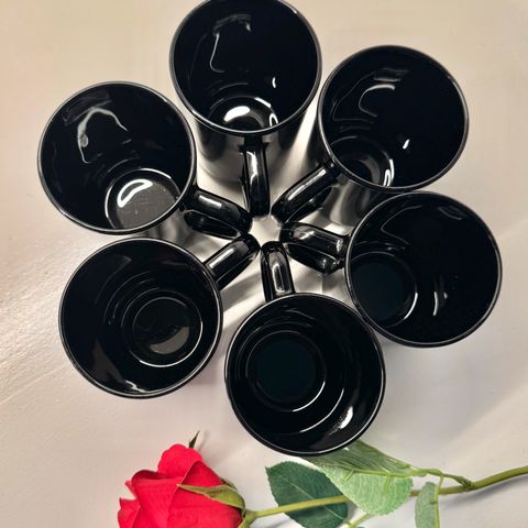 Neljä valkoista sinisellä raidalla koristettua vahvaa ranskalaista kahvikuppia Konalassa. (Merkki Arcopal)