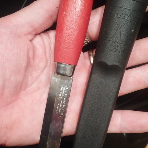 Puukko on terässä mutta kärki hieman katkennut. Hiomalla kuntoon ja keräilyihin talteen. Toimii myös hyvin aktiivikäytössä. Uusi vastaava uudella tupella ja kahvalla n. 30€