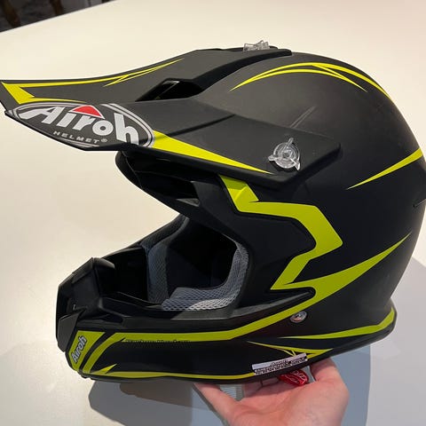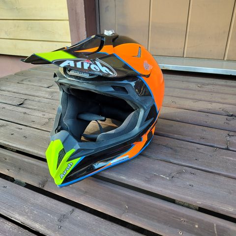Todella kevyt Airoh Terminator kypärä. Koko S (55-56). Painaa vain 1020g. Ostettu noin 5 vuotta sitten pojalle mönkijäkypäräksi. Ajeltu ehkä 20 kertaa pihassa ja pellolla. Täysin uuden veroinen. Uuden samanlaisen hinta näytti netissä olevan 250€.